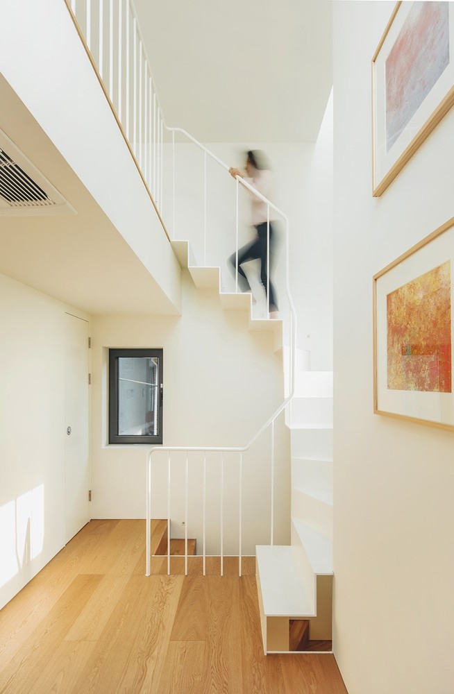Rumah ini memiliki 4 lantai yang terdiri dari dapur, kamar mandi, ruang makan, ruang baca atau perpustakaan mini, dan ruang tamu. Berbeda dengan tampilan bagian luar, bagian dalam rumah didominasi oleh kombinasi warna putih dan nuansa cokelat kayu natural, baik itu pada lantai maupun furnitur. Kombinasi dua warna tersebut membuat ruangan terlihat lebih terang dan lapang, serta menghadirkan suasana hangat dan nyaman.