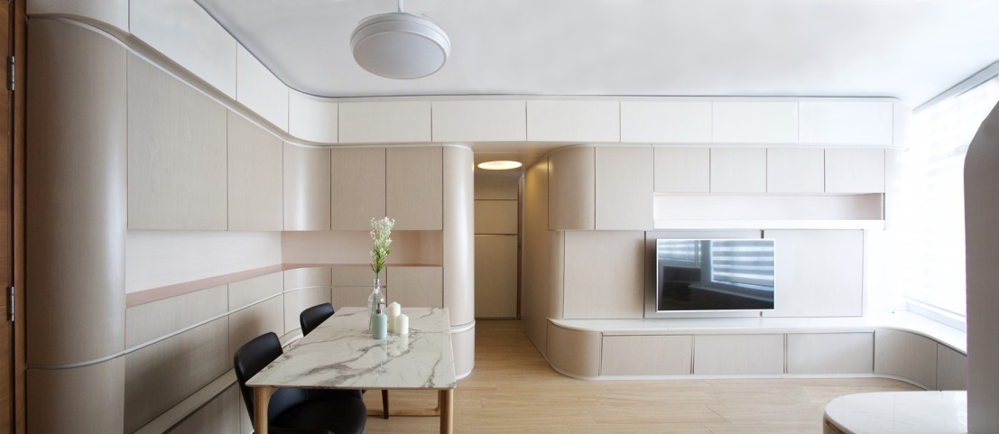 Penggunaan furnitur built-in seperti ini mampu memaksimalkan ruang terbatas agar tetap fungsional. Selain itu, desainnya yang dibuat menyatu dengan dinding mampu menghadirkan tampilan yang lebih rapi dan tetap estetik.