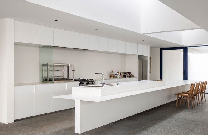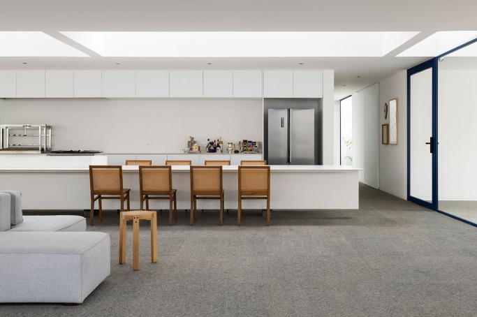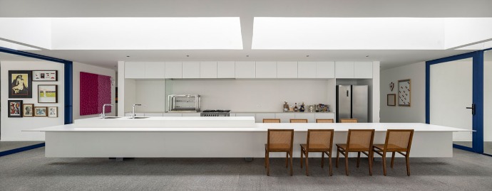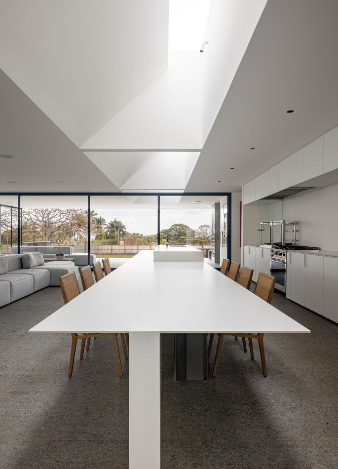Dapur di Casa Galeria bukan sekadar area memasak. Sebuah meja panjang berwarna putih dirancang sebagai elemen multifungsi yang dapat digunakan untuk bekerja, makan, dan berkumpul. Letaknya sejajar dengan bukaan cahaya di langit langit, memungkinkan cahaya alami jatuh langsung ke permukaan meja.