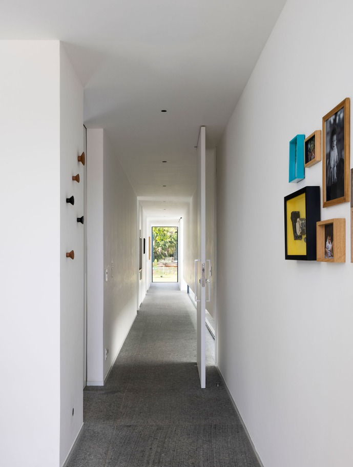 Keberadaan dapur di tengah ruang utama memperkuat fungsi sosial rumah. Aktivitas sehari hari menyatu dengan ruang galeri, menciptakan pengalaman hunian yang lebih hidup dan personal. Tidak ada pemisahan tegas antara area publik dan privat, semuanya terhubung dalam satu ruang yang cair.