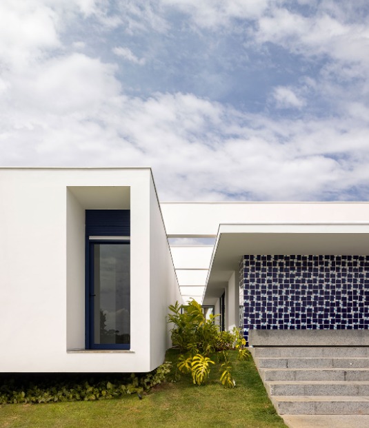 Sementara itu, tampilan eksterior rumah menghadirkan aksen panel ubin biru dan putih yang kontras. Elemen ini memberi identitas kuat pada bangunan tanpa mengganggu keharmonisan desain keseluruhan. Warna biru menjadi penanda visual yang mengikat narasi arsitektur dan seni dalam satu kesatuan.