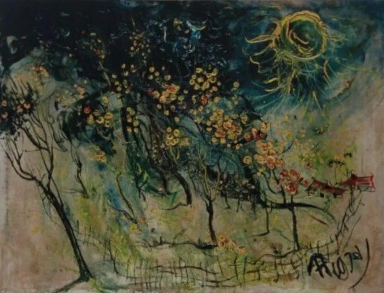Lukisan "Orange Trees, Tawangmangu" karya Affandi yang satu ini menampilkan suasana alam Tawangmangu yang dipenuhi deretan pohon jeruk yang tumbuh subur dan rimbun. Melalui sapuan yang ekspresif serta perpaduan kombinasi warna cerah yang gelap yang dinamis, Affandi berhasil menggambarkan keindahan alam sekaligus suasana pedesaan yang terasa hangat, segar, dan menenangkan.