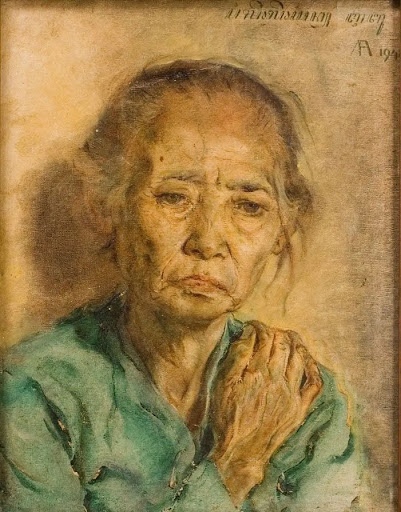 Dalam lukisan ini, Affandi menggambarkan potret sang ibu dengan sangat detail dalam balutan kebaya sederhana berwarna biru kehijauan dan raut wajah yang memancarkan kesedihan sekaligus kehangatan. Lukisan ini menjadi bentuk ungkapan cinta mendalam Affandi kepada sang ibu yang sangat berarti bagi hidupnya.