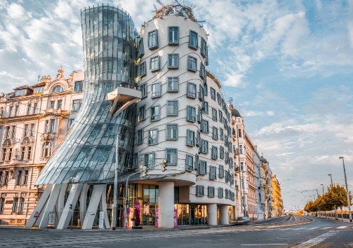 Bangunan ini selesai pada 1996 dan dikenal karena bentuknya yang menyerupai dua penari. Massa kaca dan batu dirancang untuk mencerminkan dinamika kota Praha yang sedang berubah.