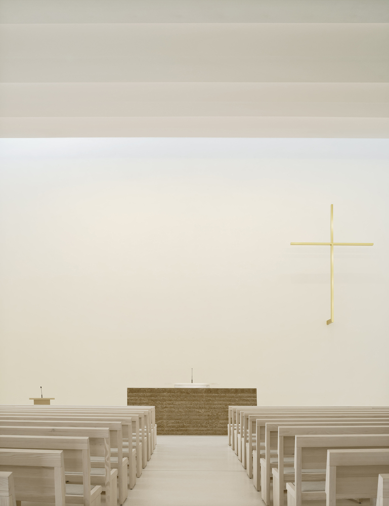 Sama halnya dengan bagian eksterior, interior gereja juga tampak bersih tanpa banyak ornamen atau elemen dekoratif tambahan. Sebuah salib minimalis berwarna emas menjadi satu-satunya ornamen sekaligus simbol keagamaan yang suci di dalam gereja, memperkuat makna spiritual tanpa menghilangkan esensi utama desain modern minimalis yang mengutamakan kesederhanaan pada ruangan.