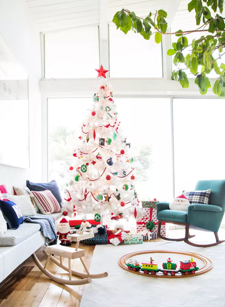 Pohon Natal putih menghadirkan kesan bersih dan modern, cocok untuk dekorasi Natal yang ingin terlihat lebih elegan. Penggunaan ornamen merah membuat tampilannya lebih menonjol sekaligus mempertahankan nuansa klasik yang identik dengan perayaan Natal.