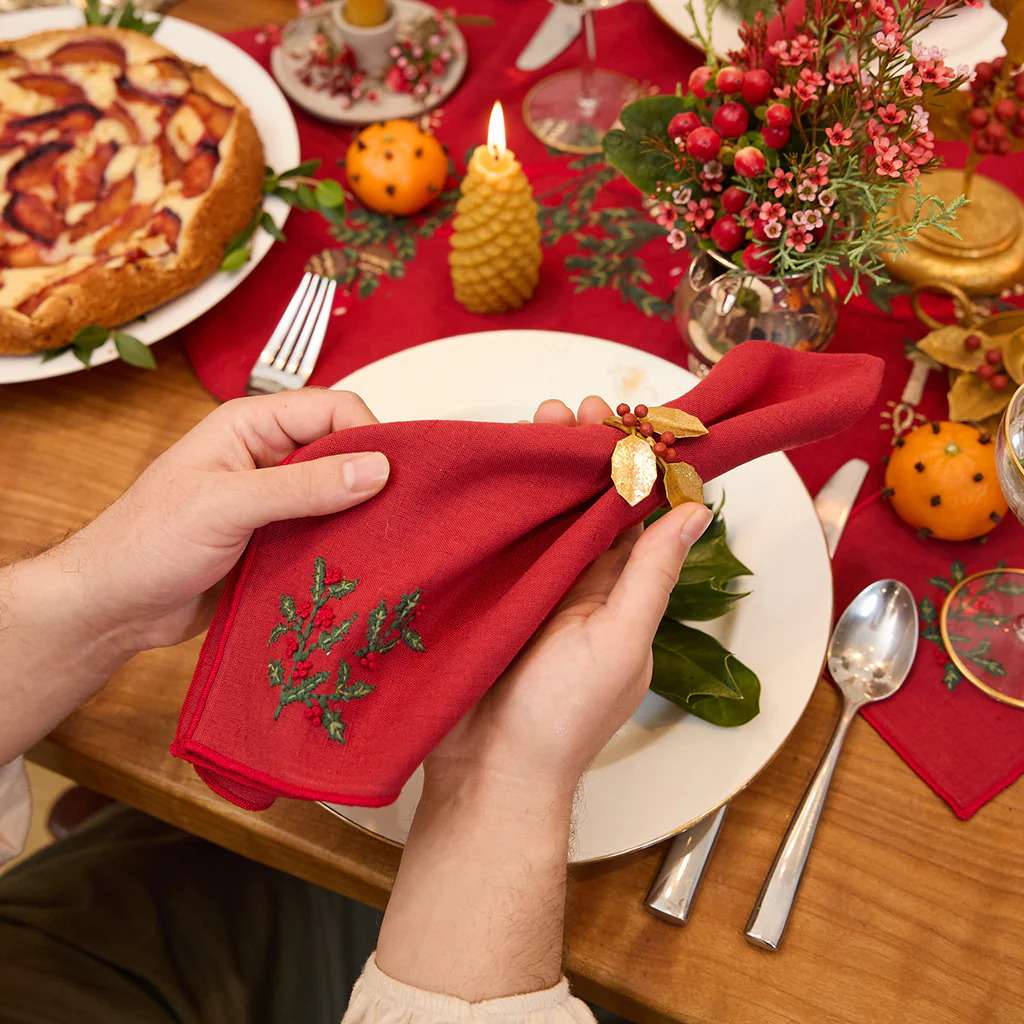 Perayaan hari raya natal rasanya belum lengkap tanpa kehadiran elemen warna ciri khasnya seperti merah, emas, hijau atau perak. Warna-warna tersebut bisa Anda sematkan dalam bentuk serbet kain, cincin serbet, gelas, atau piring aksen.