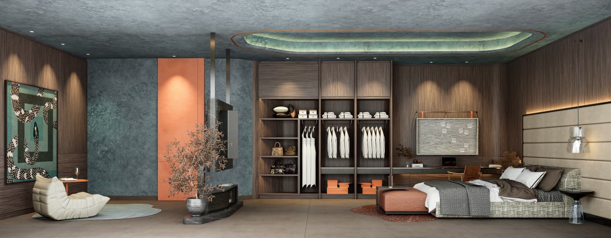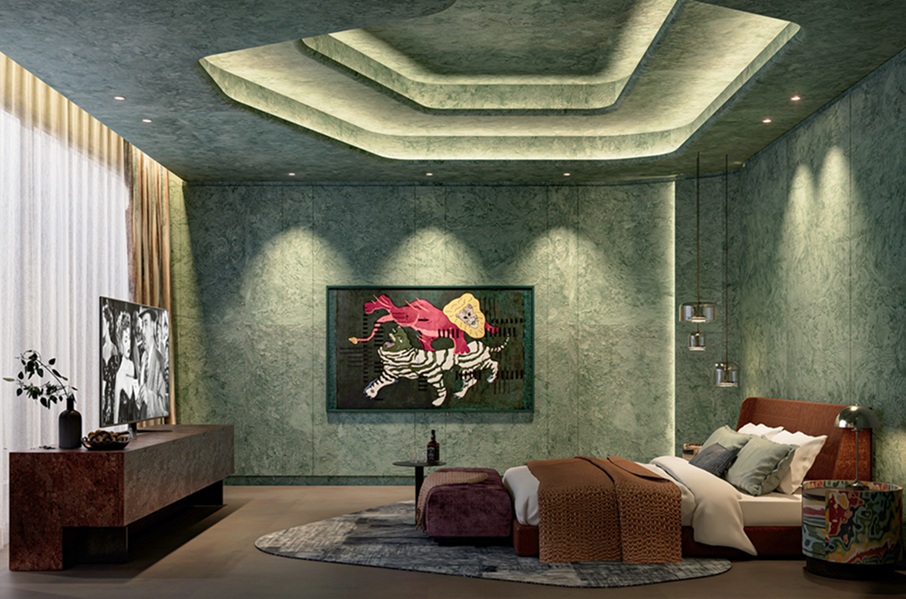 Dalam mewujudkan visi tersebut, desainer menginterpretasikannya dengan penerapan tekstur yang berani, kombinasi warna yang kontras, dan lighting berbentuk unik serta dramatis. Contohnya saja kamar tidur menggunakan textured paint berwarna vivid emerald pada dinding dan ceiling. Uniknya, drop ceiling terbagi atas dua level dengan bentuk yang dinamis ini tak hanya menyimpan indirect lighting, namun juga unit Daikin, yaitu Slim Ceiling Mounted Duct Type 2.5 HP. Penerapan ini menjadi possible berkat desain produk yang slim dengan tinggi 200 mm dan lebar 620 mm.