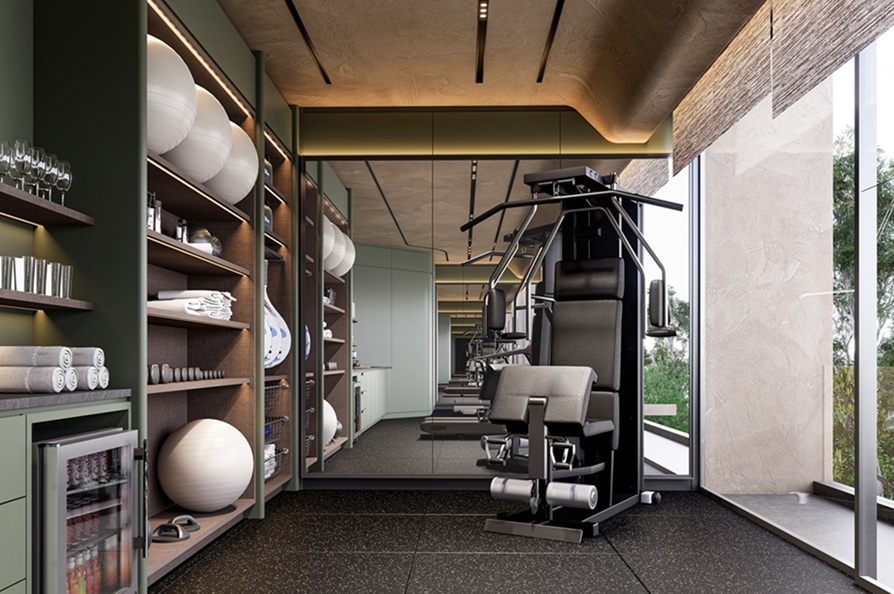 Sementara di ruang gym, unit Daikin Middle Static Pressure Ceiling Mounted Ducted Type 2 HP terintegrasi dengan seamless pada ceiling berupa Box Trox dengan tampilan garis hitam. Dengan demikian, elemen pendingin ruang hadirkan suasana yang nyaman saat temani aktivitas berat seperti berolahraga sembari menyatu dengan visual ruang tersebut.