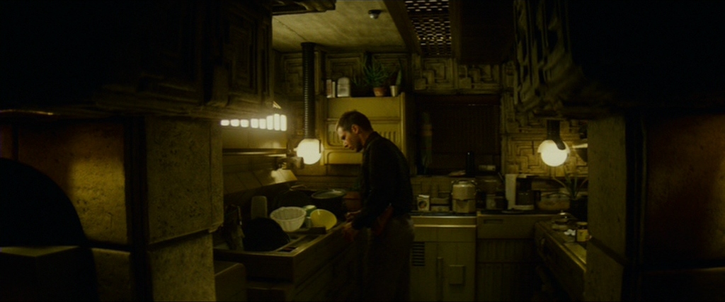 Ridley Scott memilih Ennis House karya Frank Lloyd Wright sebagai hunian Rick Deckard, sebuah keputusan yang memberi kedalaman visual luar biasa. Blok beton bermotif geometris, pencahayaan minim, dan interior yang terasa berat menghadirkan atmosfer muram khas dunia distopia.