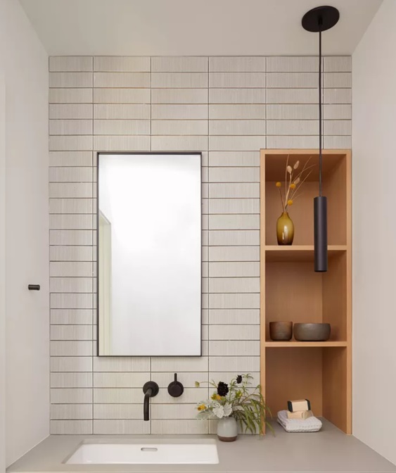 Penggunaan material kayu coklat terang pada rak yang bertemu dengan keramik berwarna putih di dinding memberikan kesan yang cerah dan reflektif sehingga membuat ruangan terasa lebih luas.