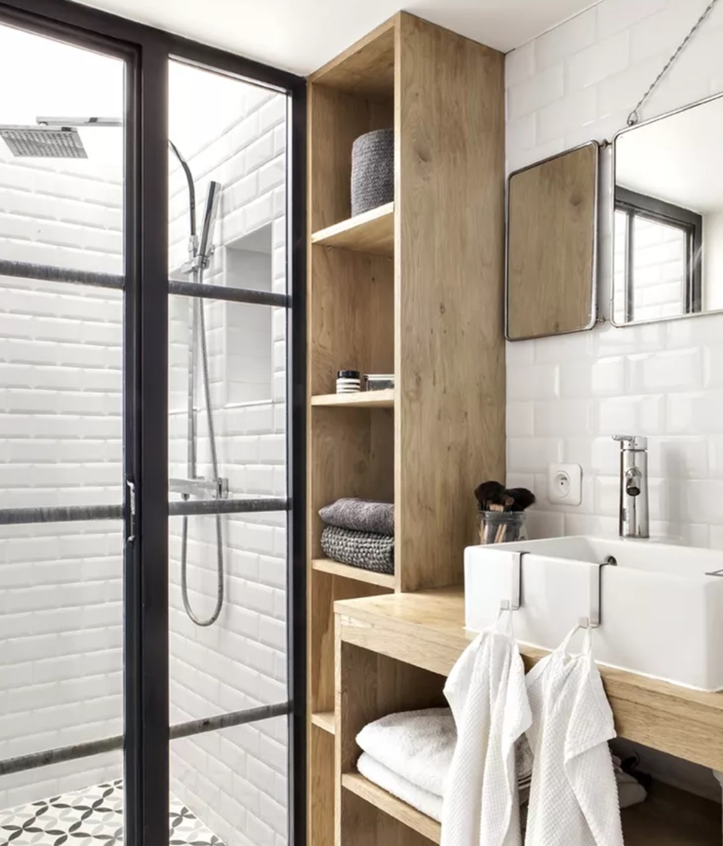 Menggunakan motif garis kotak-kotak yang tegas serta dominasi warna palet yang netral dipadukan dengan material kayu pada kabinet memeberikan kesan visual kamar mandi ukuran 1.5 x 1.5 meter ini terlihat alami dan lembut.