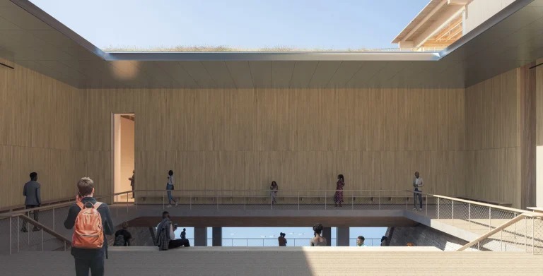 Museum ini terdiri dari dua elemen utama: paviliun galeri dan struktur bluff yang direkonstruksi sebagai dasar miring. Keduanya membentuk komposisi arsitektur yang menjembatani pusat kota dan sungai. Volume galeri berbentuk persegi panjang datar mengelilingi courtyard di dalam, dengan pelapis fasad yang terinspirasi dari warna tanah liat alami di tepi sungai. Struktur kayu pada interior dibiarkan terekspos, menghadirkan kehangatan dan kejujuran material.