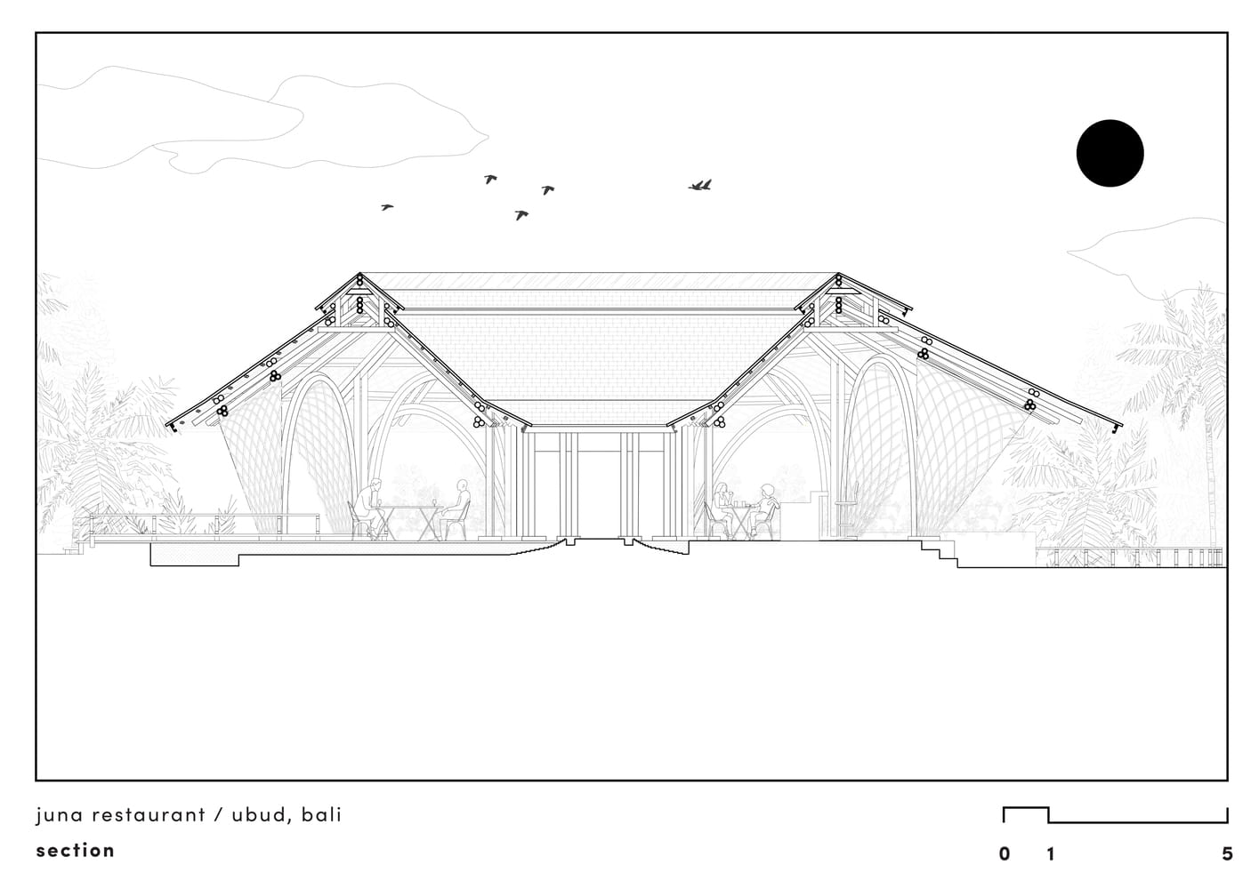 Alih-alih menyatukan atap pada satu titik puncak, yang berpotensi membuat ruang terasa tertutup dan membutuhkan struktur terlalu tinggi, atap Juna Restaurant dirancang bertingkat dan terbuka ke arah tengah. Sistem ini mengarahkan air hujan ke satu titik pusat, sambil tetap menjaga keterbukaan visual dan kenyamanan pada level mata. Struktur atap memadukan rangka lengkung dan sistem A-frame yang membentuk karakter ruang sekaligus memperkuat ekspresi arsitekturnya.