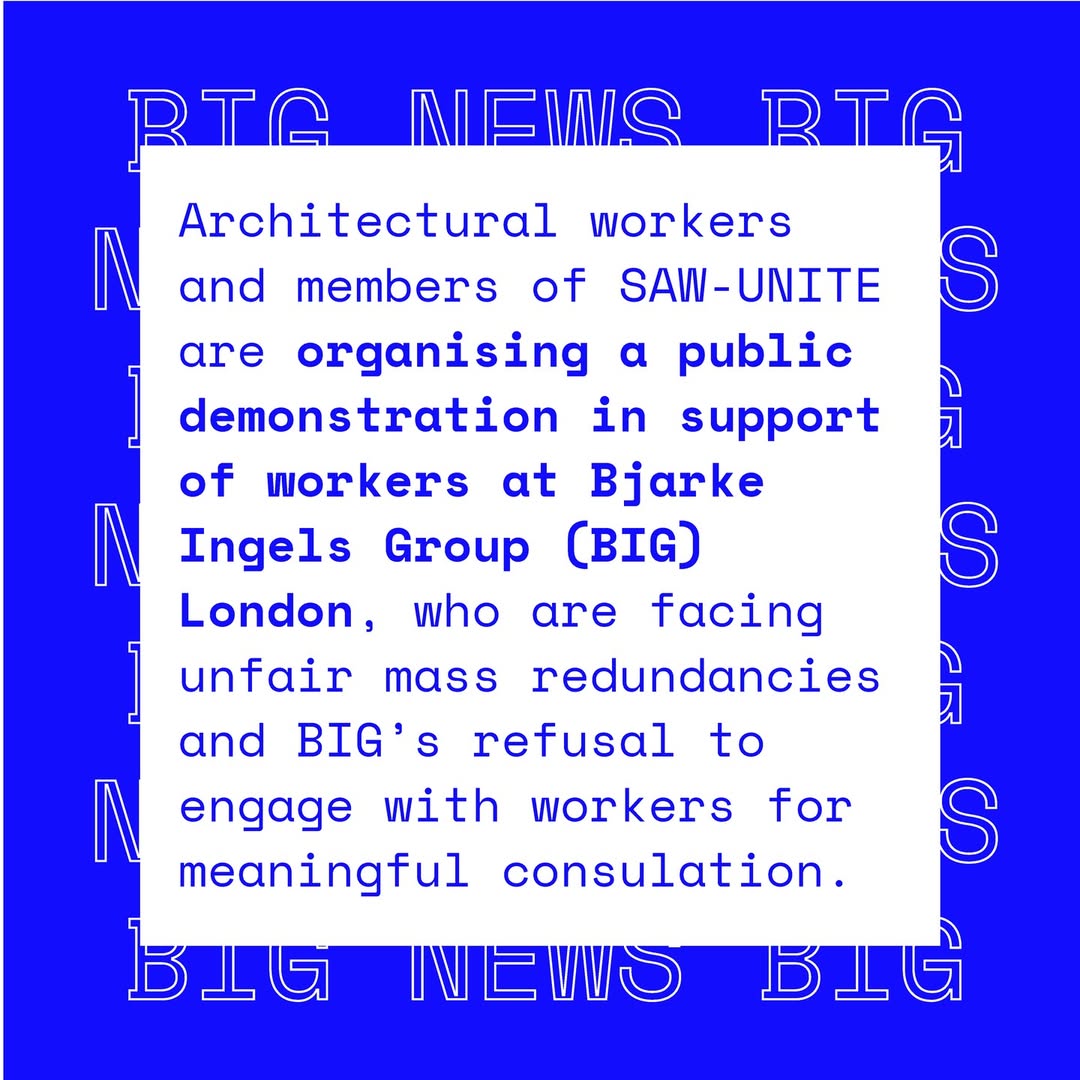 Karyawan Bjarke Ingels Group (BIG) menggelar aksi demonstrasi di luar kantor BIG London, 3 Februari 2026. Aksi ini dilakukan sebagai bentuk protes terhadap rencana pemutusan hubungan kerja massal yang diumumkan manajemen sejak Desember 2025 dan mulai dijalankan pada 5 Januari 2026. Aksi ini diorganisasi oleh Unite the Union melalui Section of Architectural Workers (SAW), serikat pekerja untuk profesional arsitektur di Inggris.