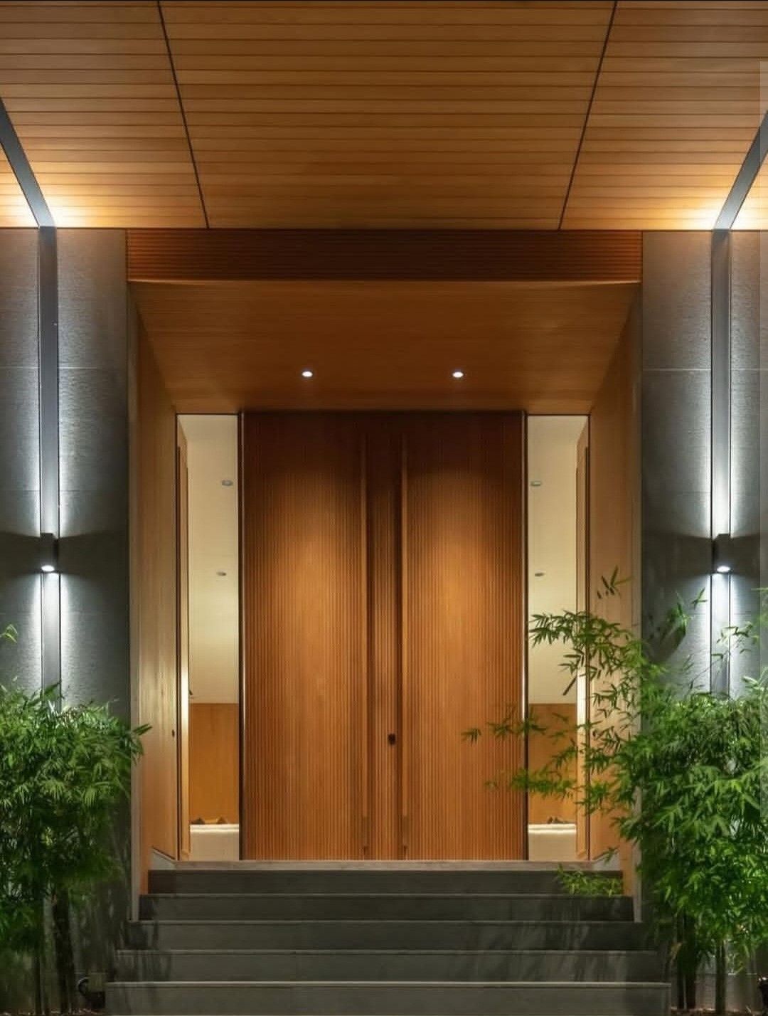 Menggunakan kisi horizontal atau vertikal yang memberi nuansa tropis hangat. Selain estetis, desain ini membantu sirkulasi udara tetap lancar di area pintu masuk.