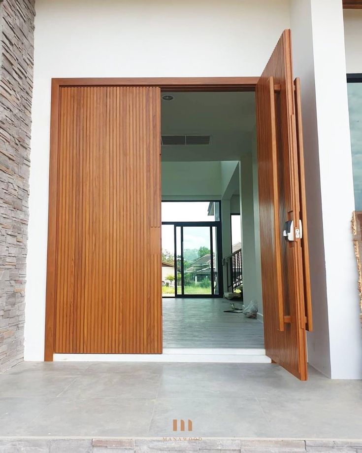 Pintu 2 daun menawarkan kesan visual yang kuat berkat bentuknya yang simetris dan proporsional. Desain ini membuat fasad rumah terlihat lebih luas dan berwibawa. Selain itu, bukaan ganda memungkinkan fleksibilitas penggunaan, cukup membuka satu sisi untuk aktivitas harian atau membuka penuh saat membutuhkan akses besar. Efek ruang yang dihasilkan juga terasa lebih terang karena cahaya alami dapat masuk lebih optimal.