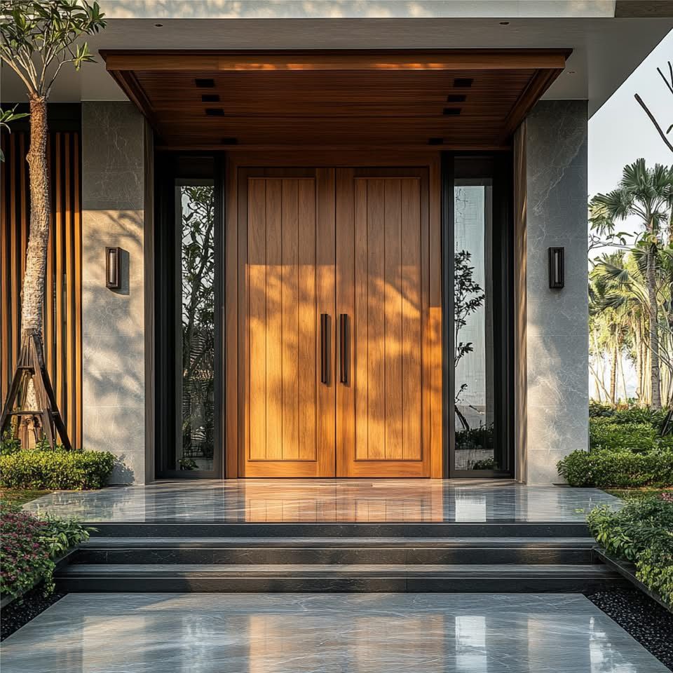 Selain jati, kayu merbau sering dipilih karena teksturnya padat dan warnanya cokelat kemerahan yang elegan. Alternatif lain adalah kayu kamper yang lebih ringan namun tetap kuat. Agar pintu awet, pastikan kayu telah melalui proses oven sehingga tidak mudah melengkung. Finishing seperti natural coating atau melamine membantu melindungi permukaan sekaligus mempertegas karakter visual kayu.