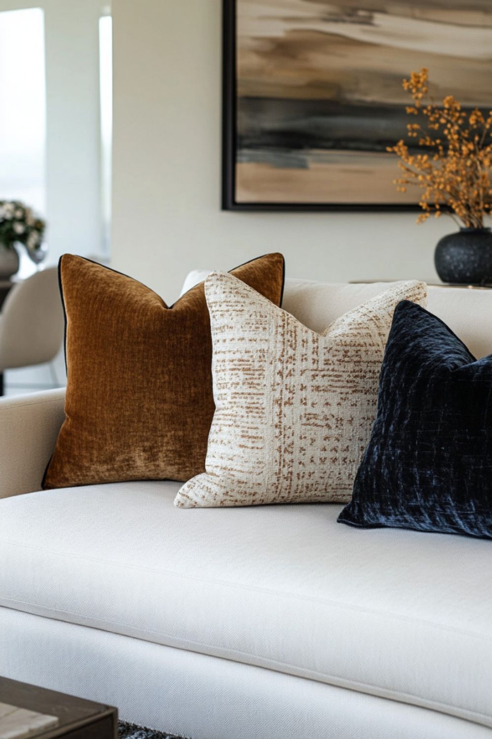 Angka ganjil menciptakan keseimbangan yang terasa alami bagi mata. Misalnya tiga bantal untuk sofa kecil, atau lima bantal untuk sofa tiga dudukan. Jika sofa Anda panjang atau berbentuk L, tujuh bantal bisa memberi efek layered yang hangat tanpa terasa penuh.