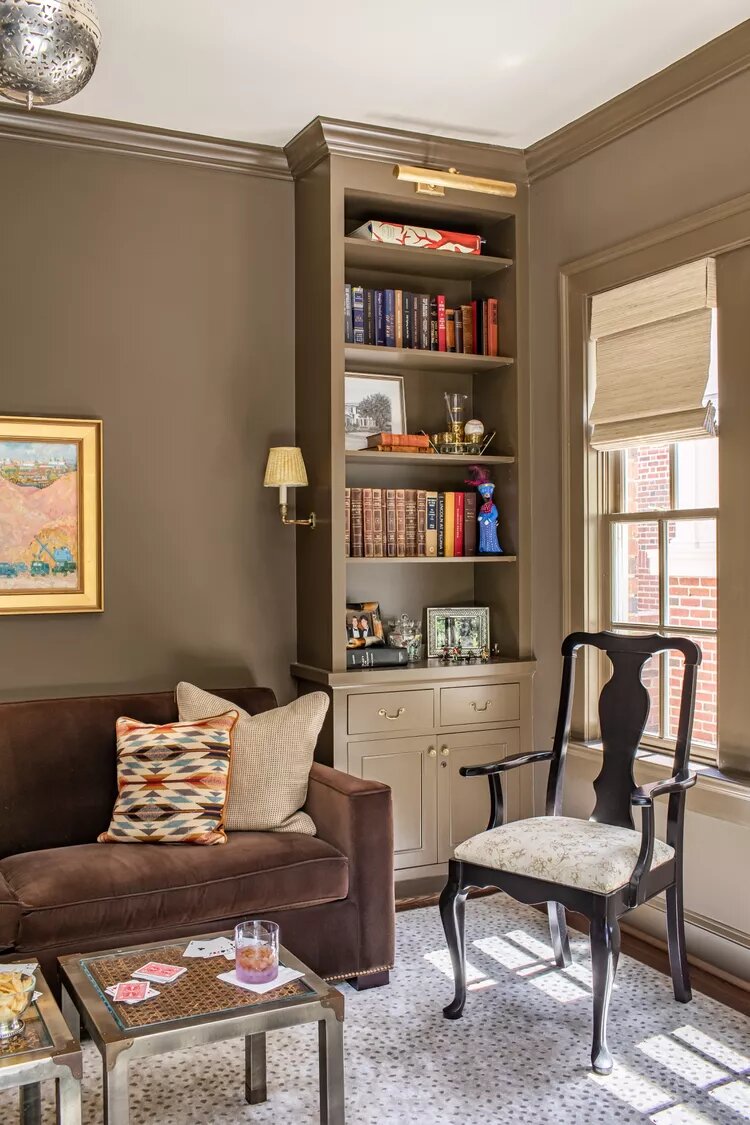 Rak buku tidak selalu harus berada di ruang kerja. Di ruang tamu, rak buku bisa berfungsi ganda sebagai lemari hias. Susunan rak terbuka memungkinkan Anda menata buku, dekorasi kecil, tanaman hias, hingga souvenir perjalanan. Kombinasi antara rak terbuka dan bagian tertutup juga membantu menyimpan barang agar ruang tetap terlihat rapi.