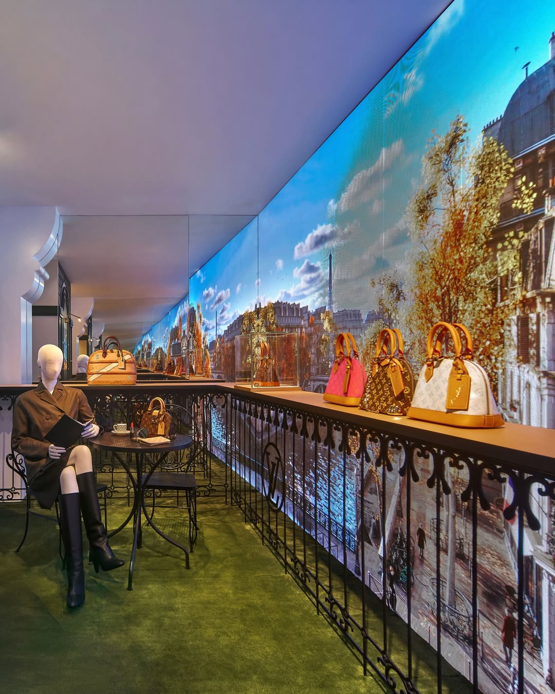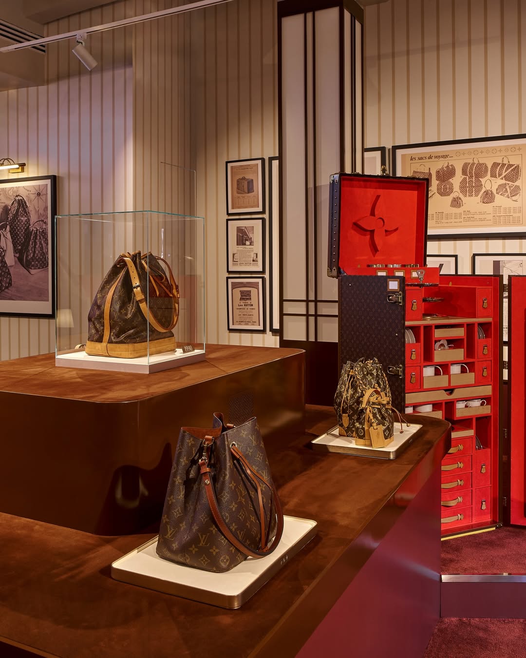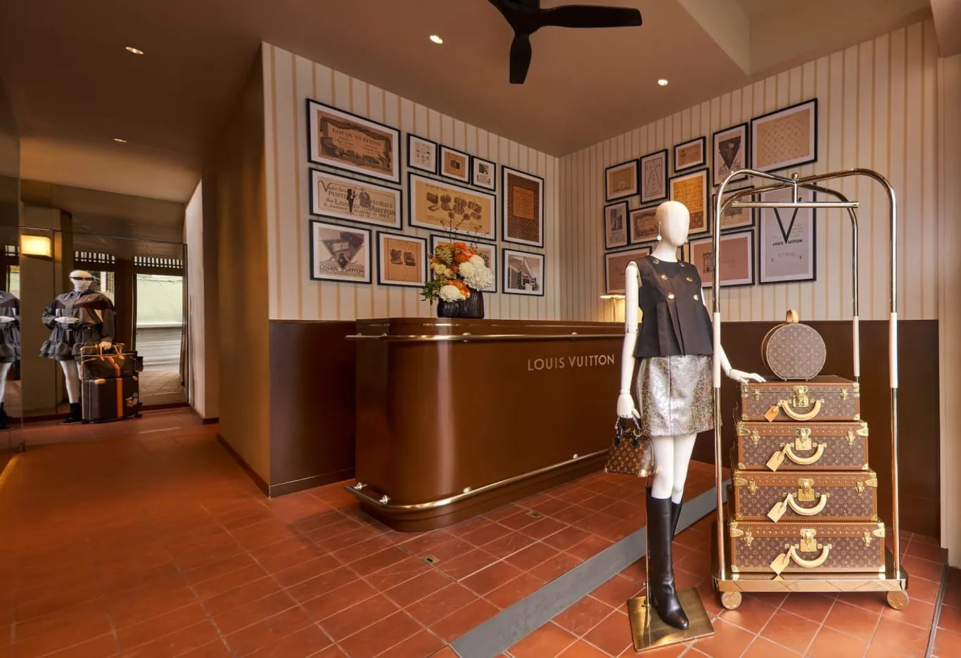 Bangunan empat lantai tersebut tidak sekadar menjadi latar, melainkan direimajinasikan secara menyeluruh. Fasadnya dibalut monogram sehingga pola ikonis yang diperkenalkan pada 1896 tampil sebagai pernyataan arsitektural. Di sini, narasi heritage dipentaskan, bukan hanya dipreservasi.