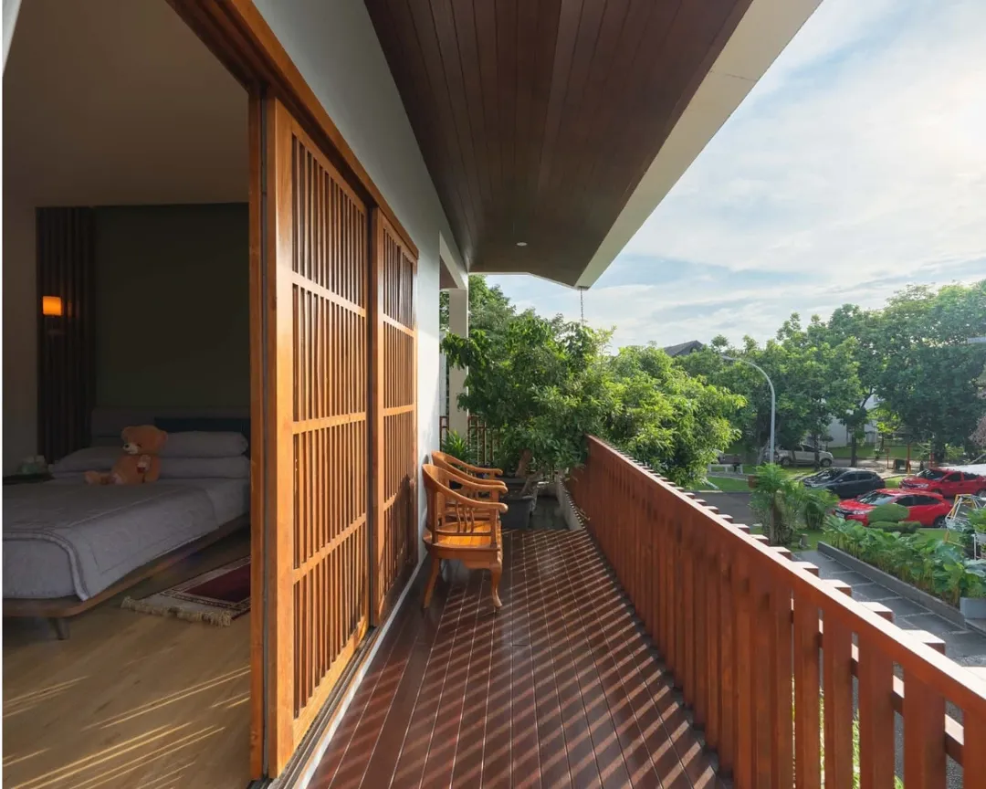 6. Balkon Natural dengan Elemen Kayu