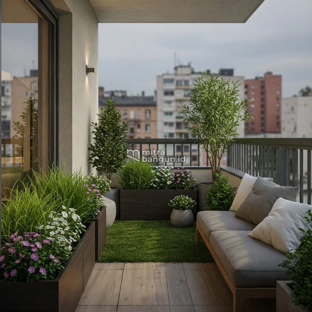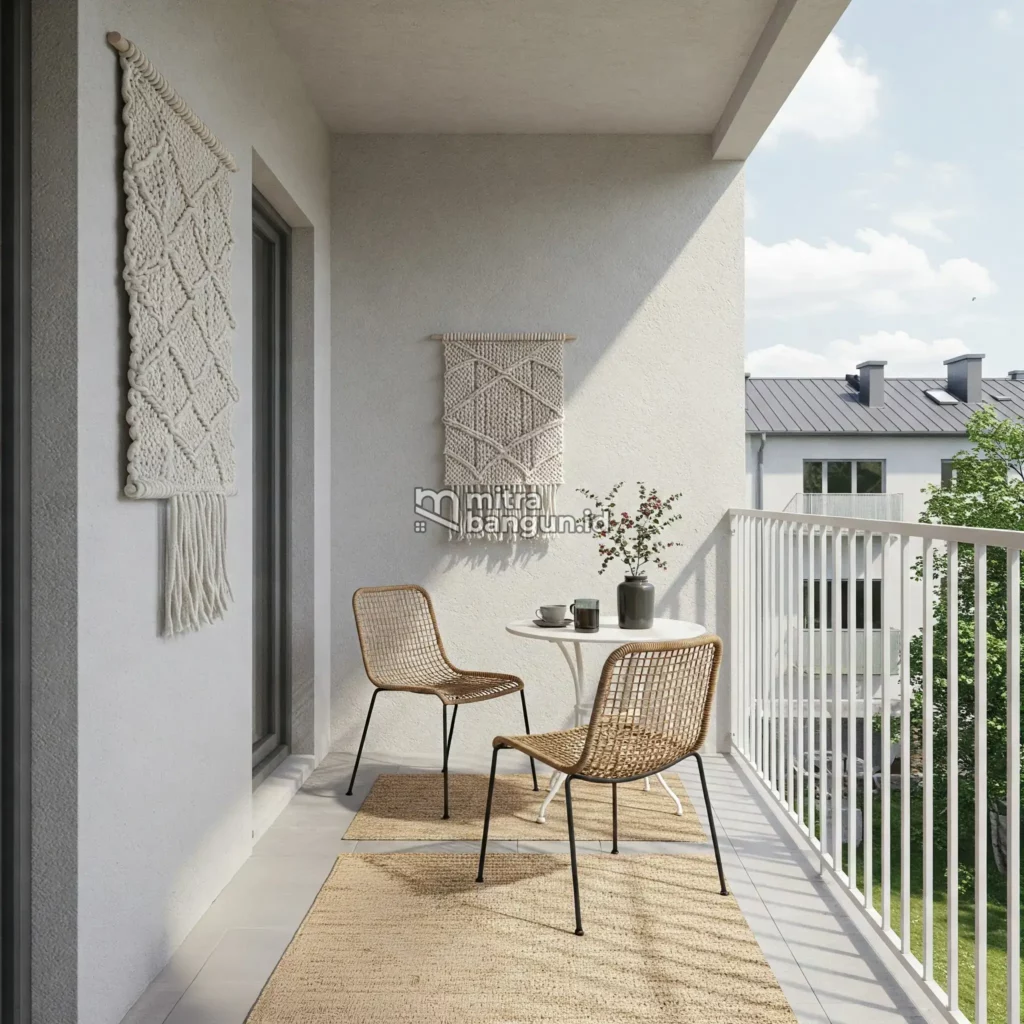 Kenyamanan balkon tidak hanya ditentukan oleh furnitur, tetapi juga oleh penataan ruangnya. Sisakan area kosong agar pergerakan tetap leluasa, dan gunakan alas seperti karpet outdoor atau decking kayu untuk menambah kenyamanan visual. Elemen ini membantu menciptakan suasana hangat sekaligus membedakan balkon dari area interior rumah.