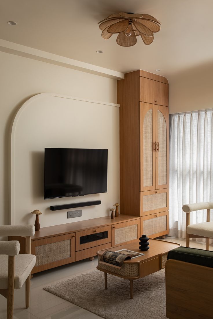 Desain simetris menjadi pilihan paling aman. Letakkan sofa di salah satu sisi dinding, lalu seimbangkan dengan kursi ringan atau tanaman di sisi lainnya. Penataan simetris membantu ruang terlihat rapi dan harmonis.