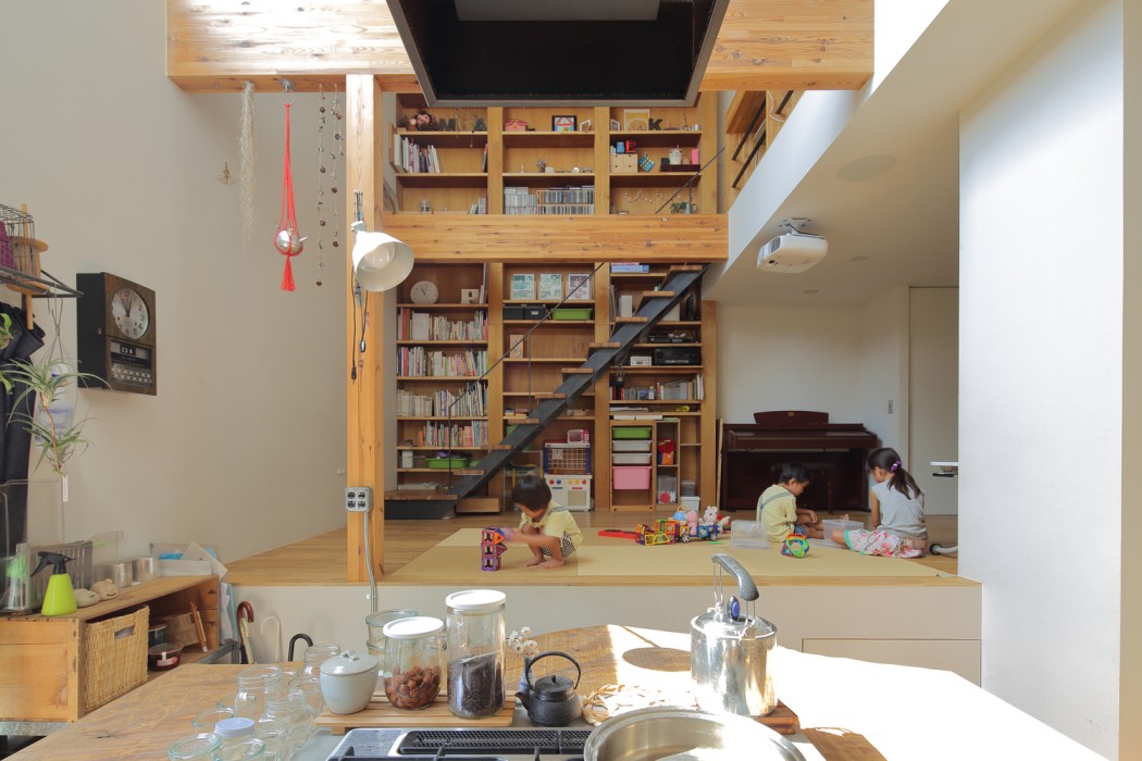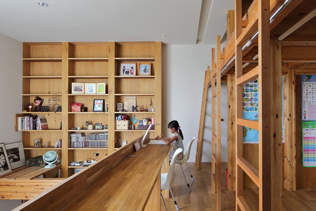 Rak buku hasil rancangan FujiwaraMuro Architects ini dirancang menyatu dengan struktur tangga, atau disebut sebagai shelf-staircase. Menggunakan material kayu berwarna terang, desain ini menghadirkan tampilan yang hangat, natural, sekaligus modern. Konsep shelf-staircase dibuat dengan tujuan untuk memaksimalkan lahan terbatas, dengan menggabungkan fungsi penyimpanan dan tangga rumah dalam satu elemen arsitektural yang efisien dan estetis.