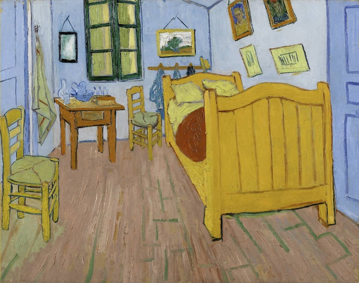 Karya seni Vincent van Gogh yang berjudul “The Bedroom” menampilkan kamar tidurnya di Yellow House di Arles, Prancis. Lukisan ini menggambarkan kamar tidur sederhana dengan tempat tidur kayu, kursi, meja kecil, serta beberapa karya seni yang tergantung di dinding. Objek-objek dalam lukisan digambarkan dengan outline yang tegas dan penggunaan warna-warna komplementer yang cerah, menciptakan kesan emosional yang kuat dan personal. Lukisan “The Bedroom” ini sering dimaknai sebagai simbol keinginannya akan kenyamanan dan kedamaian batin.
