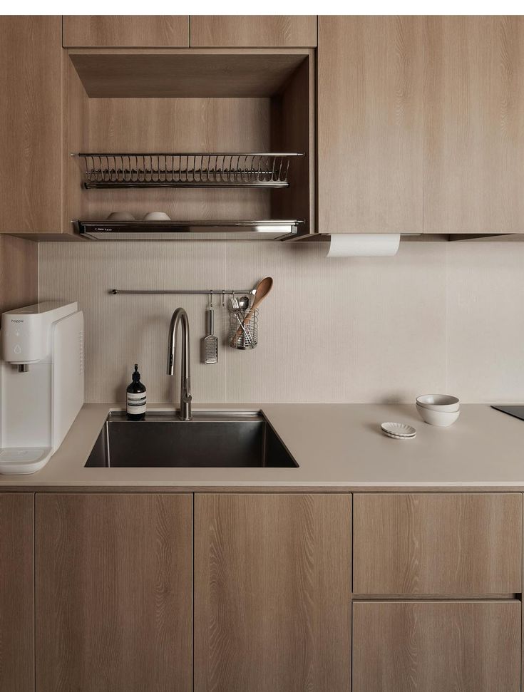 Model rak piring wastafel dari Brickwood Studio ini menghadirkan desain minimalis modern dengan kombinasi material metal dan kayu. Rak berbahan metal berwarna hitam yang mempunyai kesan tegas dipadukan dengan kabinet kayu bernuansa natural yang hangat, menciptakan tampilan yang modern, sleek, dan elegan. Posisi rak piring yang berada tepat di samping wastafel membuat proses menyimpan dan meniriskan piring menjadi lebih praktis dan efisien. Setelah dicuci, peralatan makan bisa langsung diletakkan di rak piring wastafel tanpa perlu memindahkannya ke tempat penyimpanan lain. Desainnya yang terbuka juga mendukung sirkulasi udara yang baik, sehingga piring dan gelas bisa lebih cepat kering dan terhindar dari kelembapan berlebih. Selain fungsional, tampilannya yang clean membuat area dapur terlihat lebih tertata, modern, dan elegan.