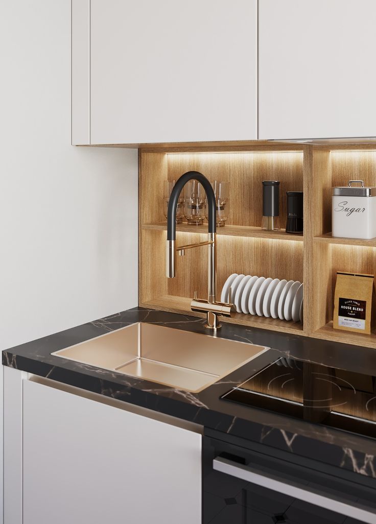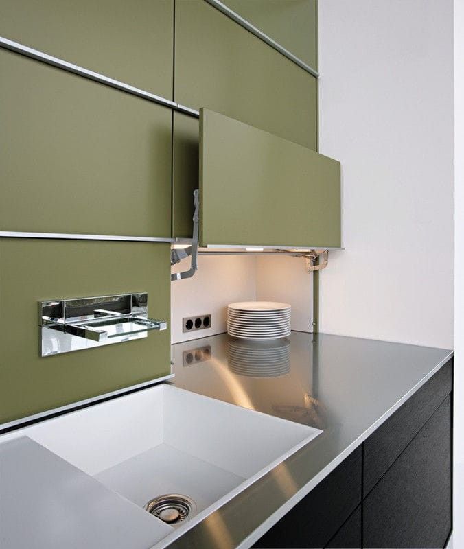 Rak piring wastafel ini dirancang menyatu dengan kitchen set dan menggunakan bukaan lift-up, sehingga lebih compact dan tidak memakan banyak ruang. Model rak piring seperti ini dapat membantu melindungi piring dan peralatan makan lainnya dari debu dan kotoran, namun tetap praktis digunakan dan mudah diakses karena posisinya yang tepat berada di samping wastafel. Setelah dicuci, peralatan makan bisa langsung disimpan tanpa perlu dipindahkan jauh. Permukaannya yang menyatu dengan countertop berbahan stainless steel menciptakan kesan sleek dan higienis, sekaligus menawarkan ketahanan yang lama untuk penggunaan jangka panjang.