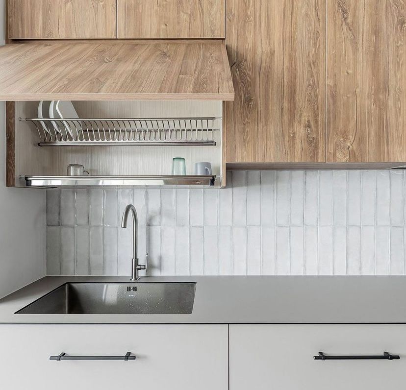 Untuk dapur compact, rak piring wastafel gantung seperti ini bisa menjadi pilihan terbaik! Desainnya sederhana, tetapi tetap fungsional untuk meniriskan dan menyimpan peralatan makan dengan rapi. Anda bisa memasang rak piring ini pada dinding tepat di atas kitchen sink. Selain bisa memaksimalkan ruang vertikal dapur, model rak piring ini juga dapat menjaga countertop tetap kering dan bersih karena tetesan air jatuh langsung ke wastafel. Dengan begitu, area kerja dapur lebih higienis dan mudah dirawat.