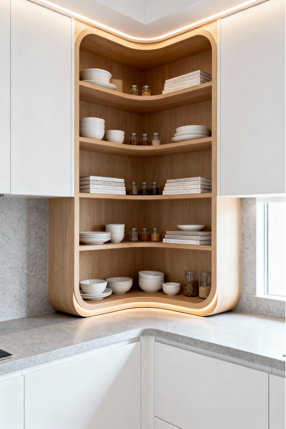 Model rak piring wastafel ini mengusung konsep rak sudut terbuka yang menyatu dengan kitchen set, sehingga dapat memanfaatkan area sudut dapur secara maksimal tanpa menyisakan ruang yang terbuang. Rak piring ini terbuat dari material kayu dengan finishing natural yang menghadirkan kesan hangat dan estetis, dengan sudut melengkung yang memberikan tampilan lebih dinamis dan modern. Posisi rak piring yang berada di samping wastafel tetap praktis digunakan untuk menyimpang piring, mangkuk, dan peralatan makan lainnya. Bahkan, rak ini juga dapat difungsikan sebagai tempat menyimpan berbagai bumbu-bumbu dapur agar lebih mudah dijangkau saat memasak.