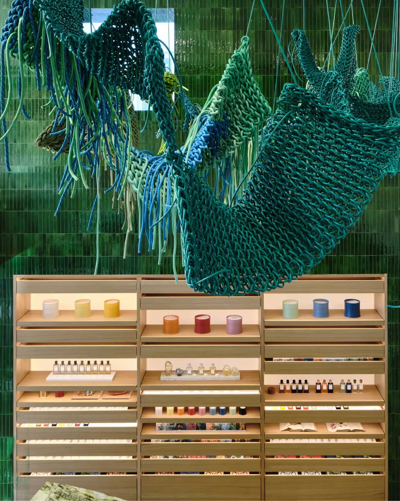 Desain arsitektur toko mengambil inspirasi dari dunia botani, memadukan identitas Spanyol khas Loewe dengan referensi desain Korea. Fasad dan interior dilapisi ubin keramik handmade berwarna teal blue, emerald, lime green, hingga turquoise yang menciptakan karakter visual kuat sekaligus menenangkan.