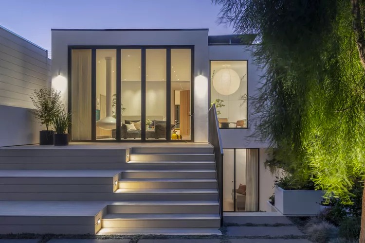 1. Gunakan pencahayaan untuk keamanan dan elemen estetika. Misalnya, lampu LED tersembunyi di bawah pijakan memberikan efek dramatis sekaligus meningkatkan keamanan untuk pijakan di malam hari.