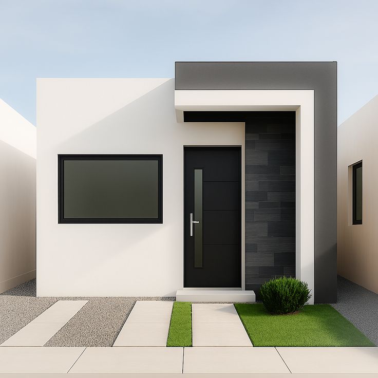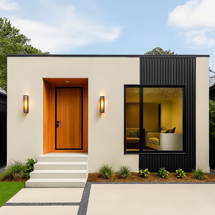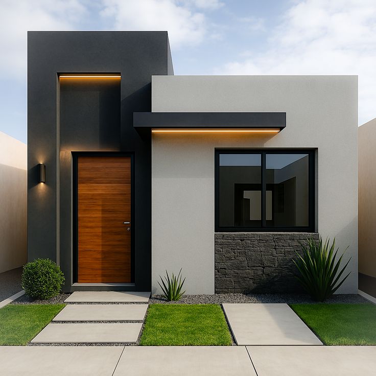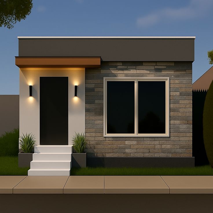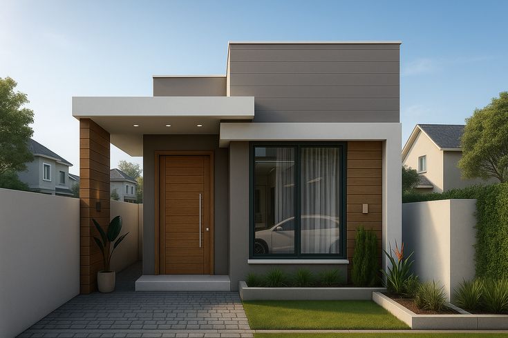 Salah satu inspirasi populer adalah fasad minimalis satu bidang dengan permainan garis horizontal. Tampilan ini biasanya menggunakan kombinasi dinding polos dengan satu bidang aksen seperti batu alam atau panel kayu. Desain ini membuat rumah 7x9 terlihat lebih modern dan proporsional tanpa terlihat penuh.
