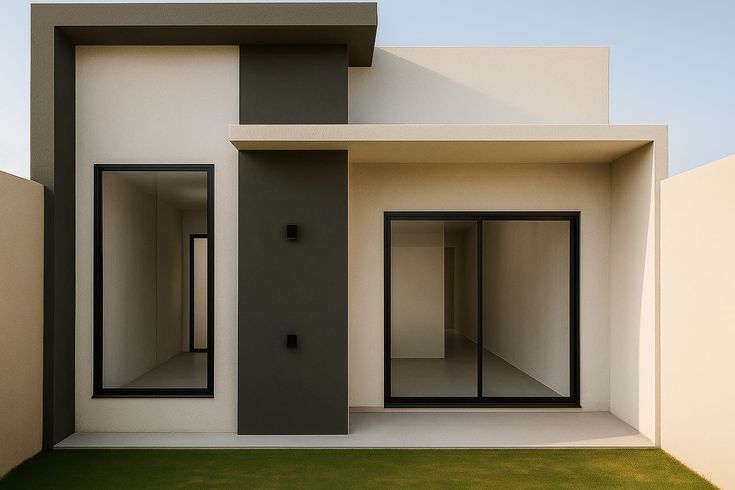 Desain fasad dengan kanopi datar menjadi pilihan yang banyak digunakan pada rumah ukuran kecil. Kanopi sederhana dengan rangka besi atau baja ringan dapat mempertegas tampilan modern sekaligus melindungi teras dan pintu utama dari panas dan hujan.