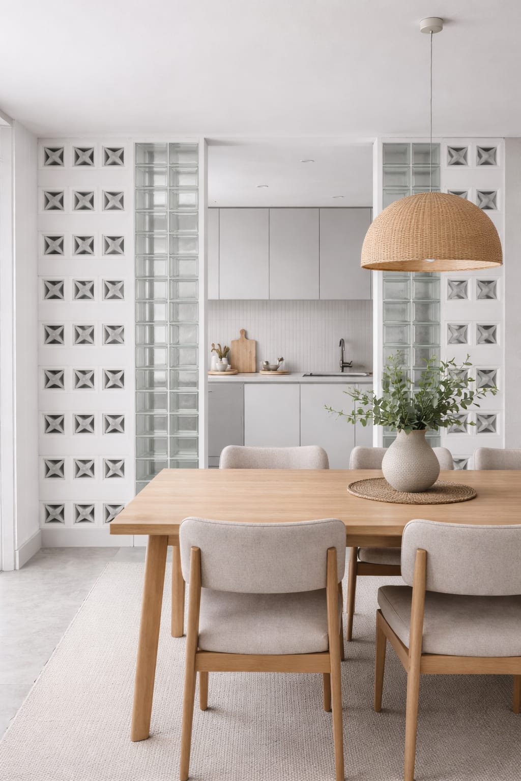 Jika Anda ingin membatasi ruang tanpa membuatnya terasa sempit, gunakan roster dan glass block sebagai partisi. Misalnya antara dapur dan ruang makan.