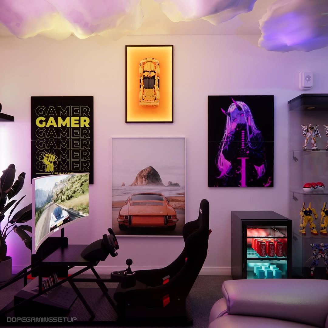 Dinding gaming room bisa menjadi kanvas ekspresi. Selain poster, kamu bisa menggunakan wall sticker geometris, neon sign dengan kata-kata favorit, atau artwork digital. Elemen ini memberikan karakter visual yang kuat tanpa memakan banyak ruang.