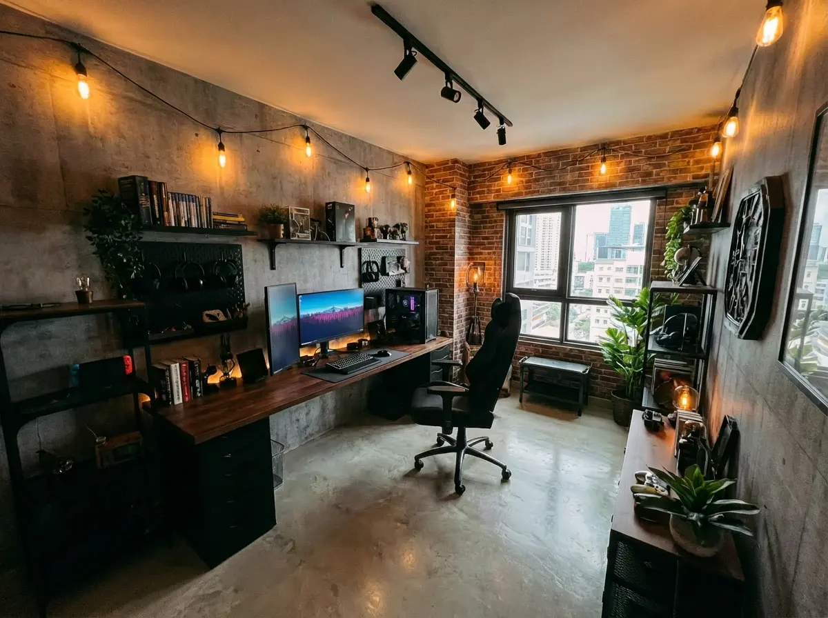Gaya industrial menghadirkan karakter kuat melalui material ekspos seperti beton, besi, dan kayu. Dinding dengan tekstur unfinished atau wallpaper motif semen dapat menjadi latar yang menarik. Padukan dengan furnitur berbahan metal dan lampu gantung bergaya industrial untuk menciptakan ruang gaming yang maskulin dan berkarakter.