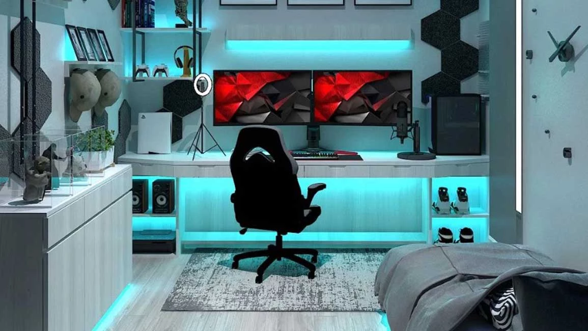 Dekorasi futuristik identik dengan permainan cahaya dan warna. Lampu RGB yang ditempatkan di dinding, bawah meja, atau di belakang monitor mampu menghadirkan suasana imersif layaknya ruang gaming profesional. Pilih warna cahaya yang bisa diatur intensitasnya agar tetap nyaman di mata dan menyesuaikan mood bermain.
