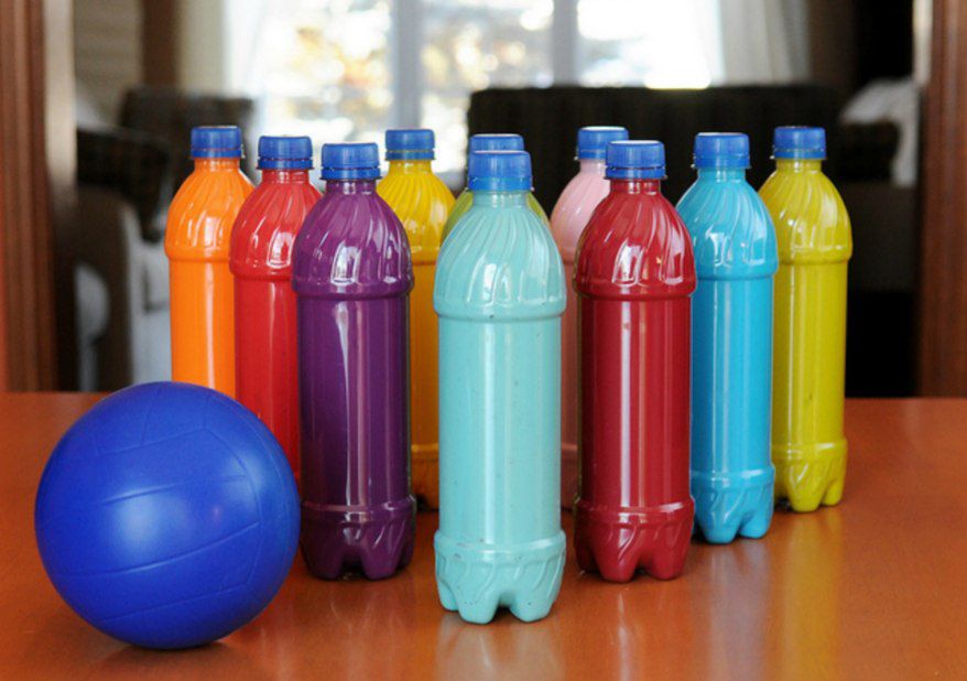Dengan beberapa botol plastik kosong sebagai pin dan bola ringan, Anda bisa mengubah ruang keluarga menjadi arena bowling mini.