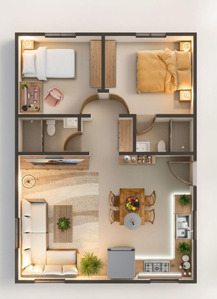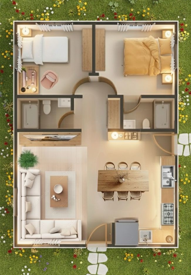 Pada denah ini, dua kamar tidur ditempatkan berdampingan di satu sisi rumah. Area depan biasanya difungsikan sebagai ruang tamu atau ruang keluarga, sedangkan dapur dan kamar mandi berada di bagian belakang. Tata letak ini membuat area privat terasa lebih tenang.