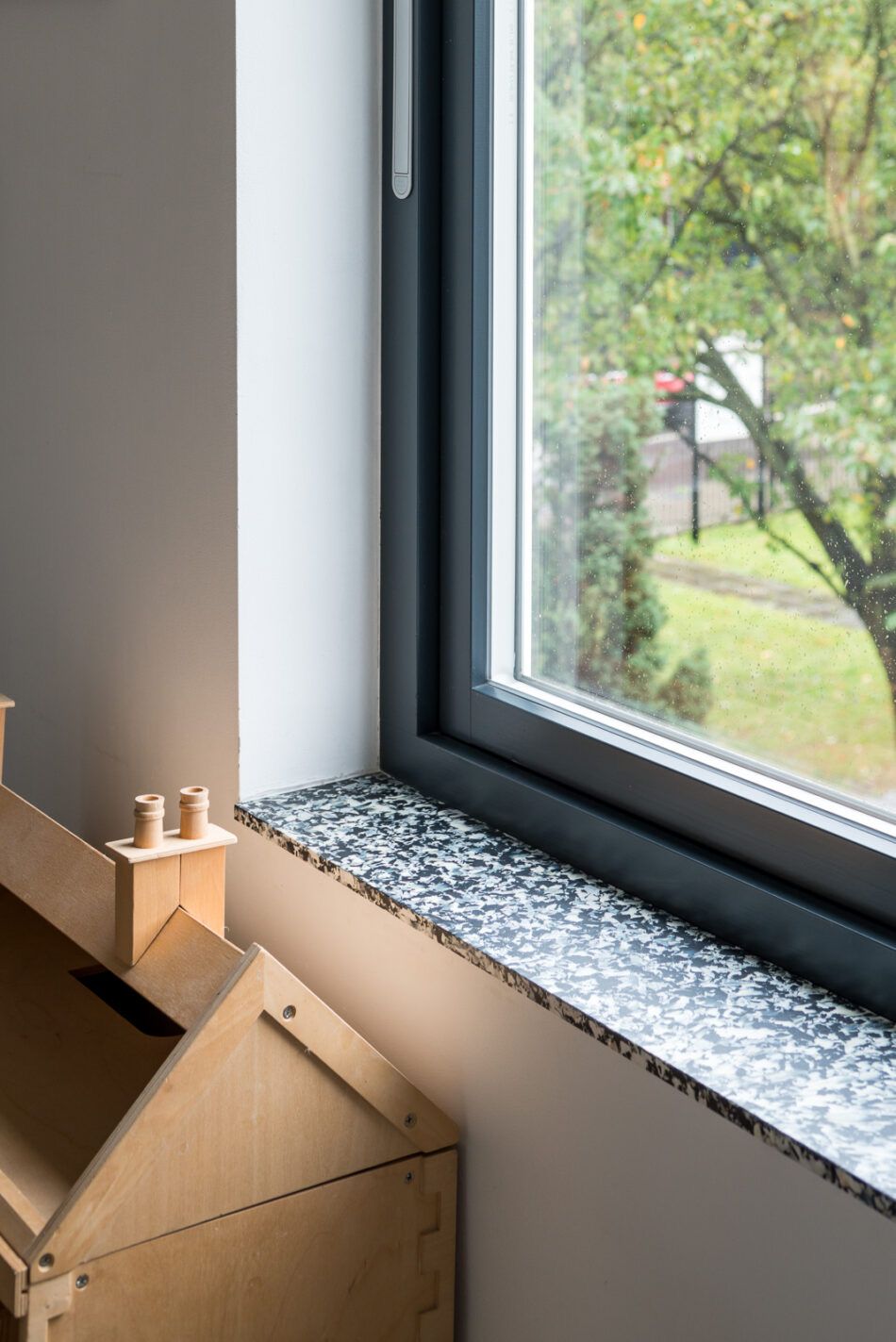 Finishing hitam matte memberikan kesan tegas dan elegan pada jendela. Model ini sering digunakan pada rumah bergaya modern atau industrial karena menciptakan kontras yang menarik pada dinding rumah.