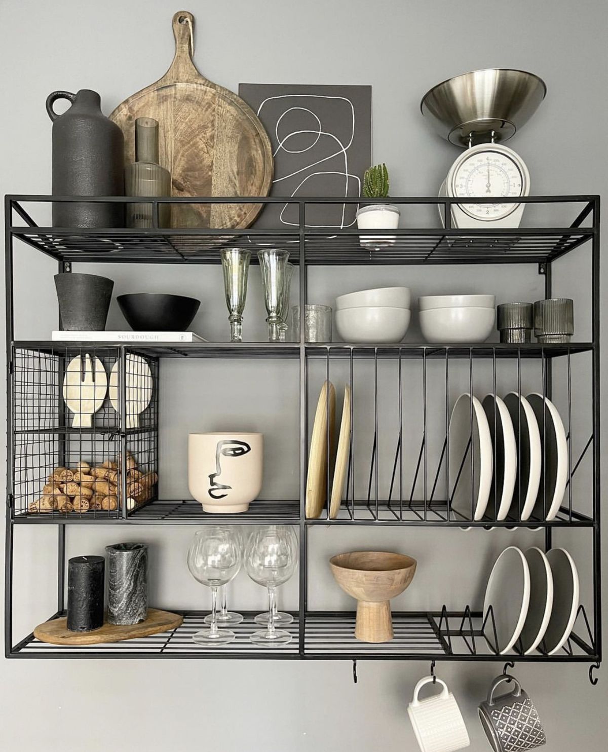 Rak yang dilengkapi dengan gantungan dapat digunakan untuk menyimpan sendok, spatula, atau cangkir. Desain ini membuat dapur terlihat lebih praktis.