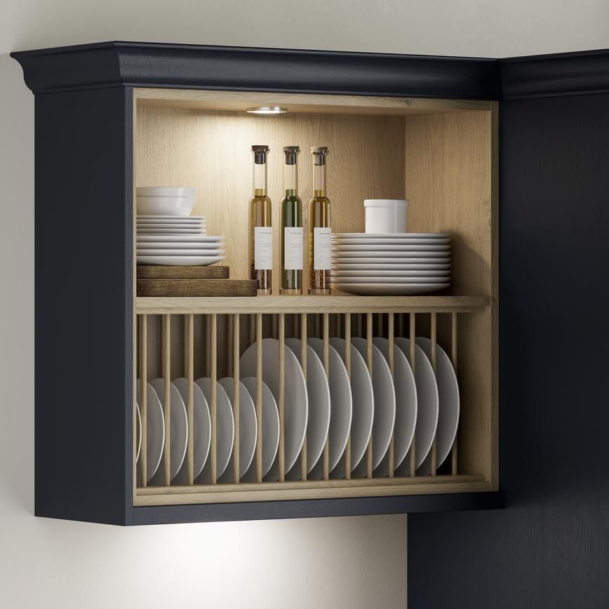 Rak kayu dengan warna natural memberikan kesan hangat dan sederhana. Desain ini cocok untuk dapur bergaya minimalis atau skandinavia.