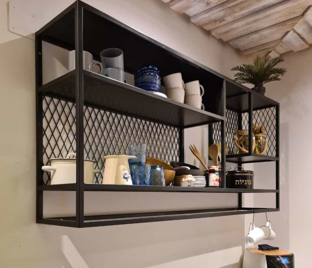 Rak berbahan besi dengan desain sederhana memberikan tampilan yang modern dan kokoh. Model ini sering digunakan pada dapur bergaya industrial.