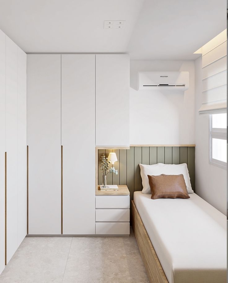 Lemari pakaian sebaiknya dipilih dengan desain ramping atau menggunakan model pintu geser. Desain ini membantu menghemat ruang sekaligus membuat kamar terlihat lebih modern.