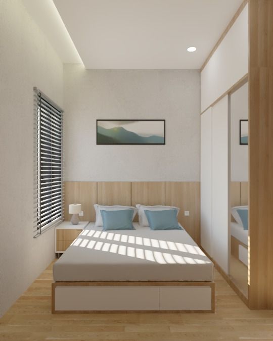 Desain ini mengutamakan kesederhanaan dengan warna netral dan furnitur minimal. Tampilan kamar terlihat rapi dan bersih sehingga terasa lebih luas.